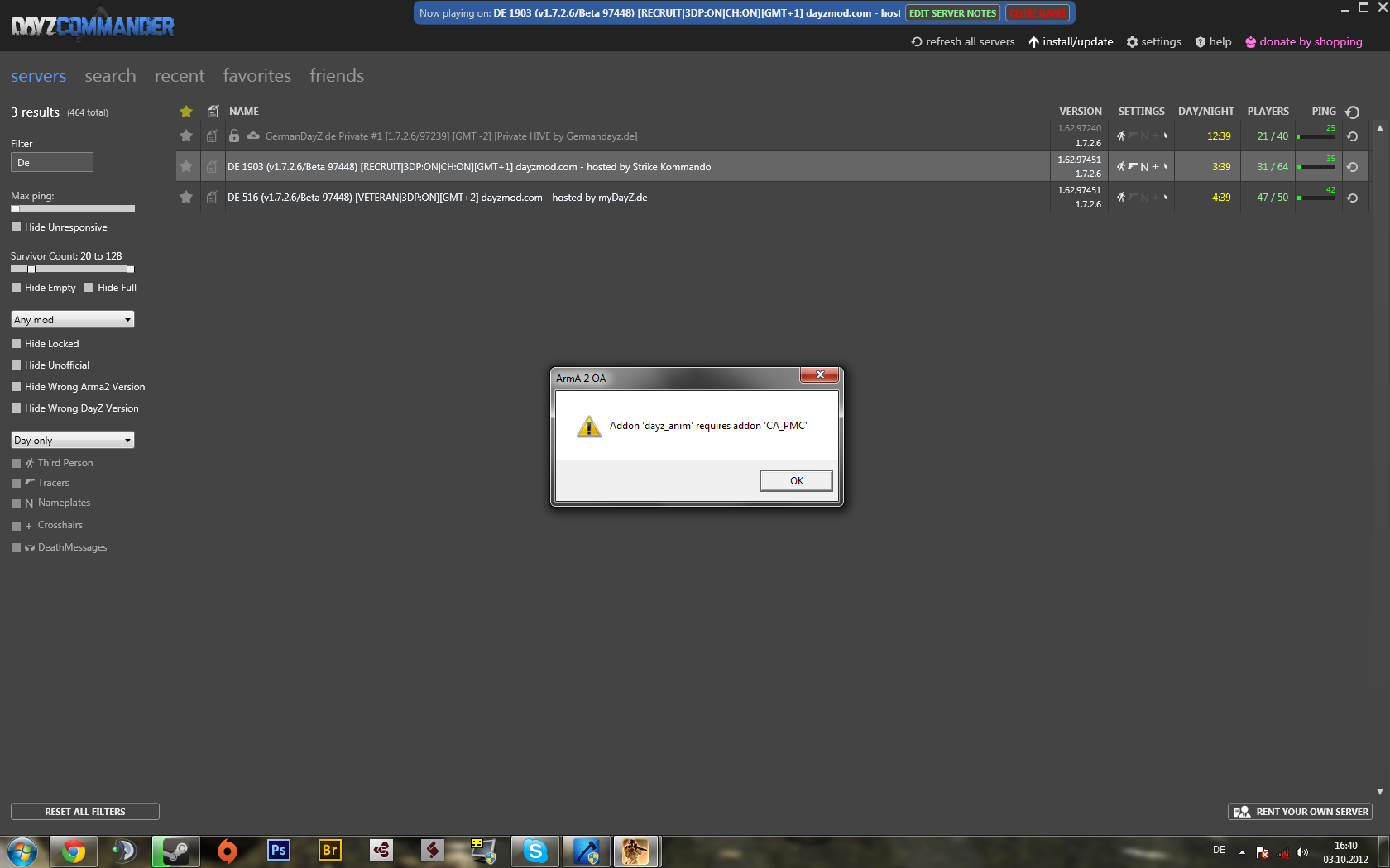 Und danach habe ich per Dayz Commander Arma2 geupdated und Dayz installiert, und dann bekam ich diese Fehlermeldung. " Addon 'dayz_anim' requires addon 'CA _PMC' http://i.epvpimg.com/W9CIh.png | und danach startet sich das Spiel, aber ich kann nicht auf den Server. Ich habe damals über Amazon Arma2 Combined Operations gekauft.